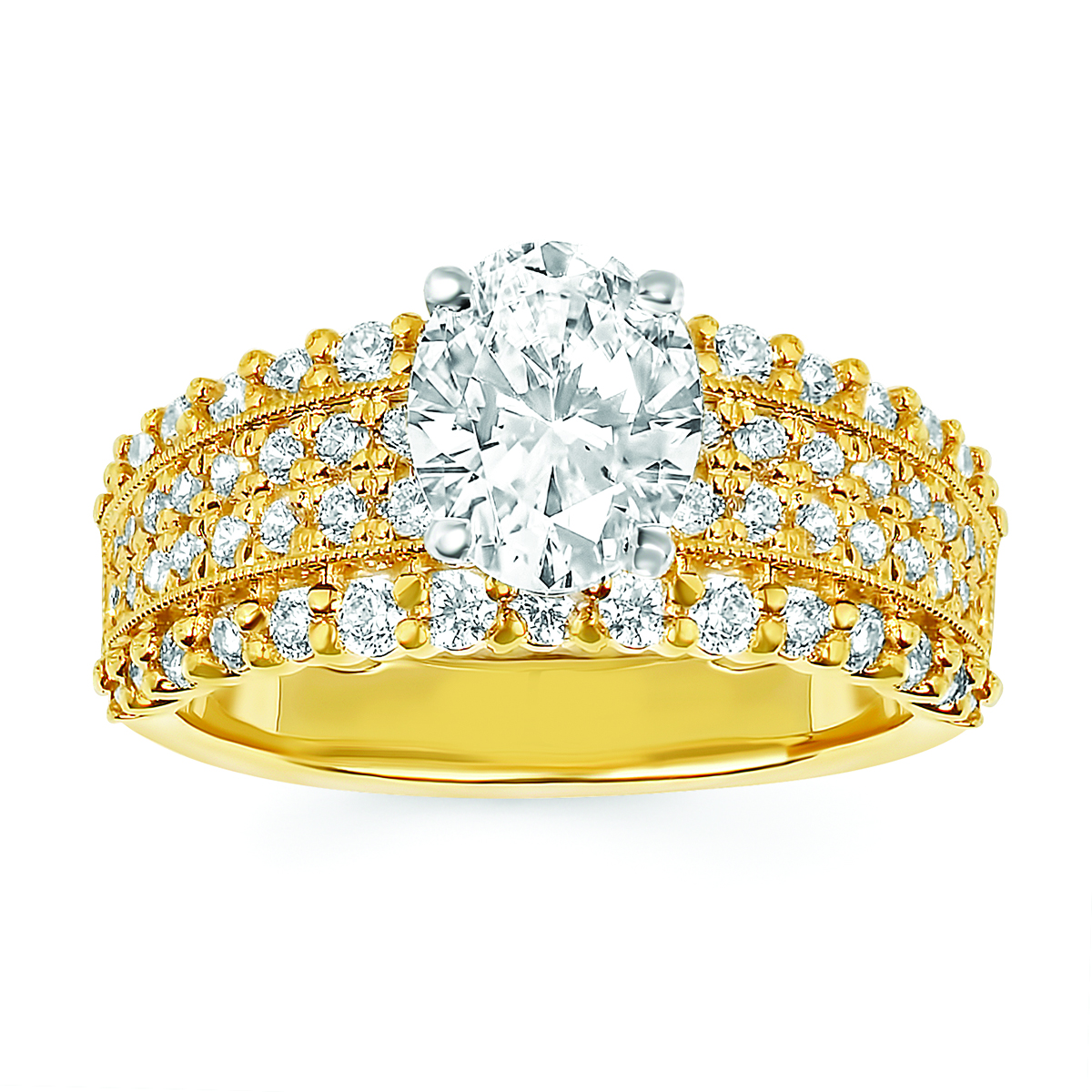 Engagement Ring Classic Bridal: 1Ctw. Diamond Semi Mount shown with 2 Ct. Oval Center Diamond in 14K Gold